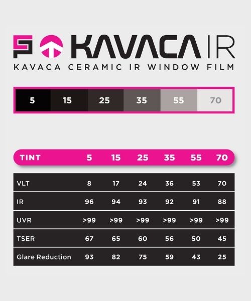 KAVACA CERAMIC IR is the ultimate Window Film, manufactured with state of the art technology. Ceramic Pro has formulated a proprietary formulation of nano-ceramic technology with an IR layer to deliver excellent heat rejection, glare control and UV protection that is metal-free; supporting signal clarity for all types of electronic devices. KAVACA Ceramic IR lets you customize your car with any of the 6 shades offered, without sacrificing clarity nor the loss in heat rejection with clear VLTs. KAVACA Ceramic IR advanced technology offers a non-reflective, color stable finish that will not fade over time.